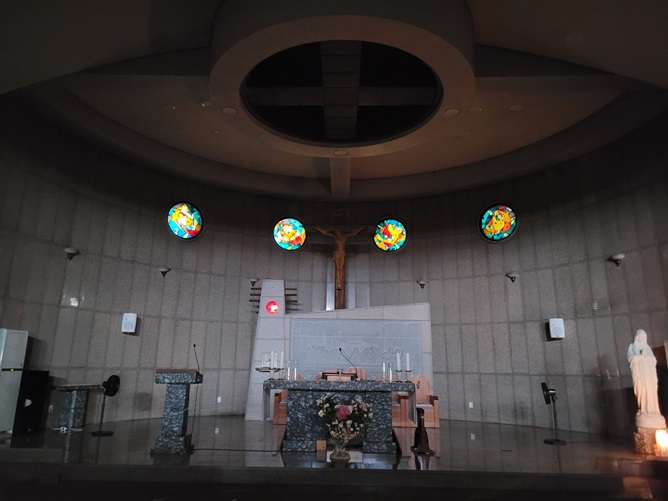 위 사진은 평화동성당 성전 입구 맞은편에 있는 스테인드글라스입니다.